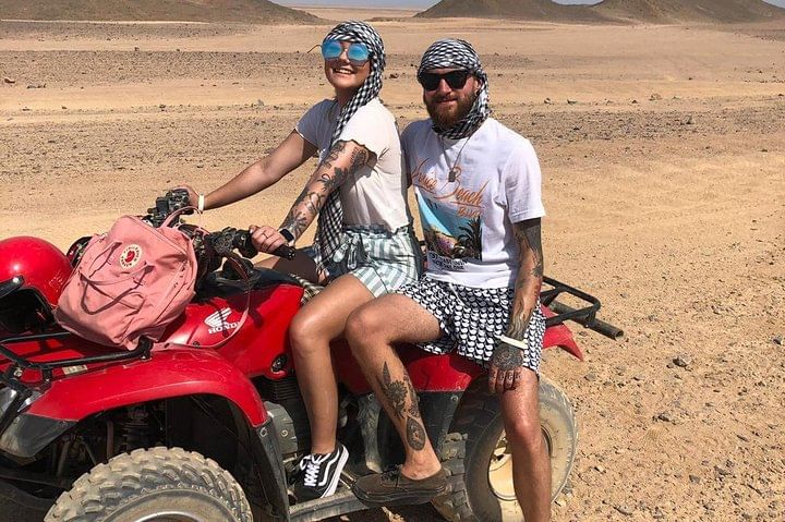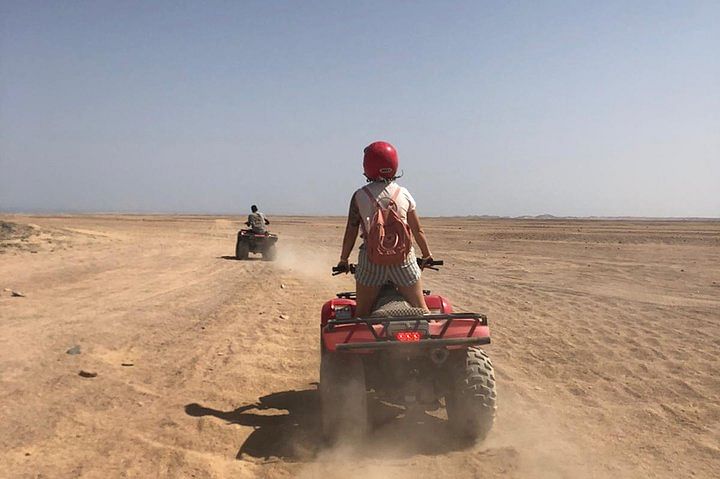 Experience an exhilarating sunset safari in Hurghada, featuring a thrilling quad bike drive, a scenic camel ride, and convenient transfers. Your adventure begins with a high-energy quad bike ride across the stunning desert landscape, where you'll navigate through sand dunes and rocky terrain as the sun begins to set, creating a dramatic backdrop. Following your quad bike adventure, embark on a serene camel ride, offering a unique and tranquil way to take in the expansive desert vistas and the changing colors of the sky. The tour includes seamless transfers to and from your accommodation, ensuring a hassle-free experience from start to finish. This action-packed excursion combines excitement with scenic beauty, providing a memorable and immersive desert adventure in Hurghada.