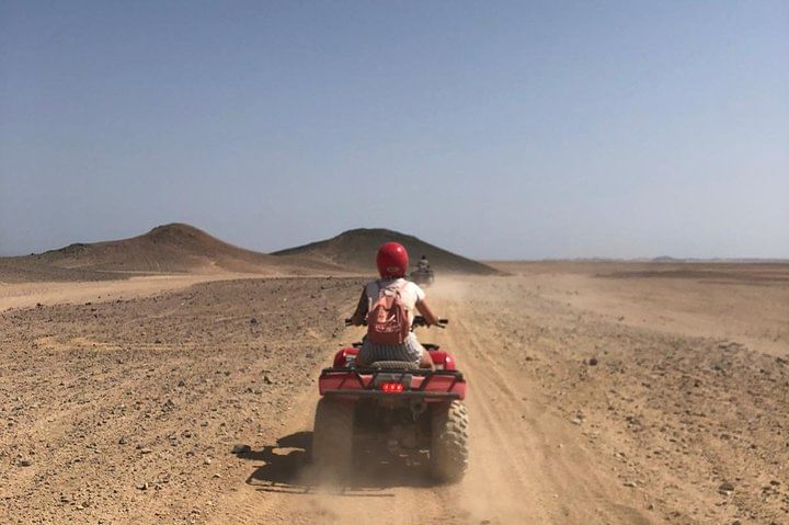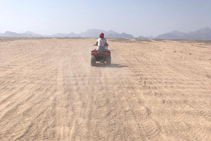 Experience an exhilarating 3-hour sunset safari in Hurghada, featuring a thrilling quad bike drive, a scenic camel ride, and convenient transfers.