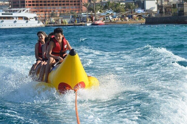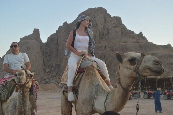 Experience the ultimate desert adventure in Sharm El Sheikh, where land and water activities come together for an unforgettable experience. Race across the dunes on an ATV, ride a majestic camel, and soar high with parasailing. Discover the underwater world on a banana boat and glass-bottom boat tour. Relax with a traditional Bedouin tea and enjoy a tasty lunch while surrounded by stunning landscapes. This action-packed excursion has something for everyone, whether you're a thrill-seeker or a nature enthusiast.