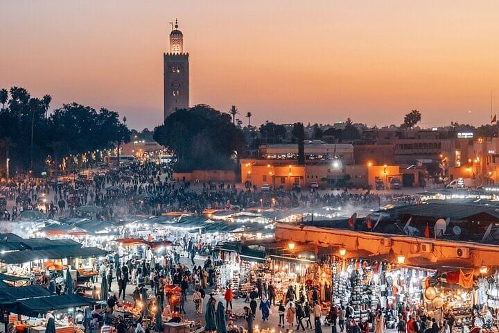 Discover the vibrant soul of Marrakech on this guided tour, visiting the city's most renowned landmarks: Jemaa el-Fnaa, Koutoubia Mosque, Bahia Palace, and Medersa Ben Youssef. Experience Morocco’s rich cultural heritage firsthand.