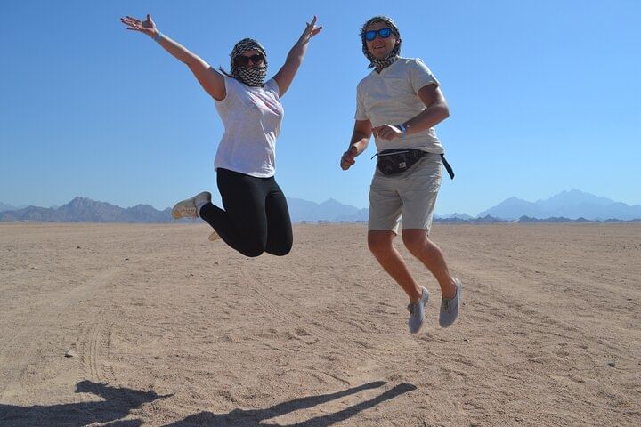 Your journey begins with an exhilarating jeep safari through the stunning desert landscapes, where you’ll experience the rugged beauty and serene vistas of the Marsa Alam region.