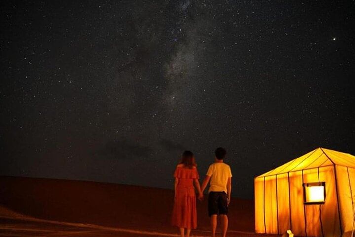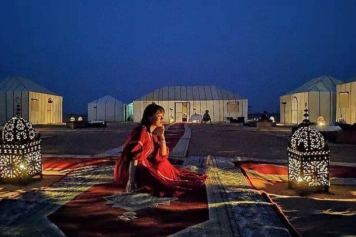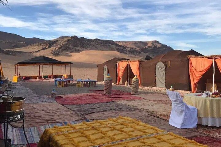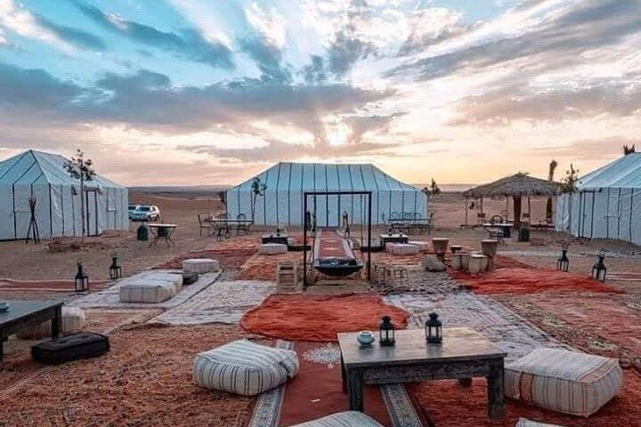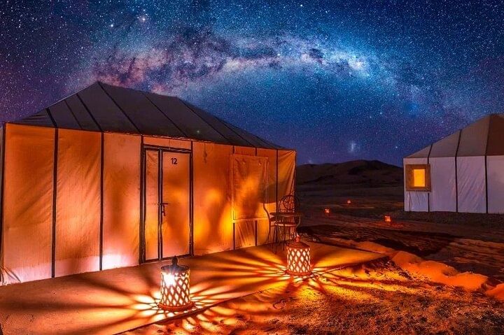 As evening falls, settle into a luxury desert camp where Berber mint tea, a flavorful Moroccan dinner, and stargazing by the fire await. After a restful night in a nomadic-style tent, return to Marrakesh with unforgettable memories of Morocco’s southern landscapes, culture, and hospitality.